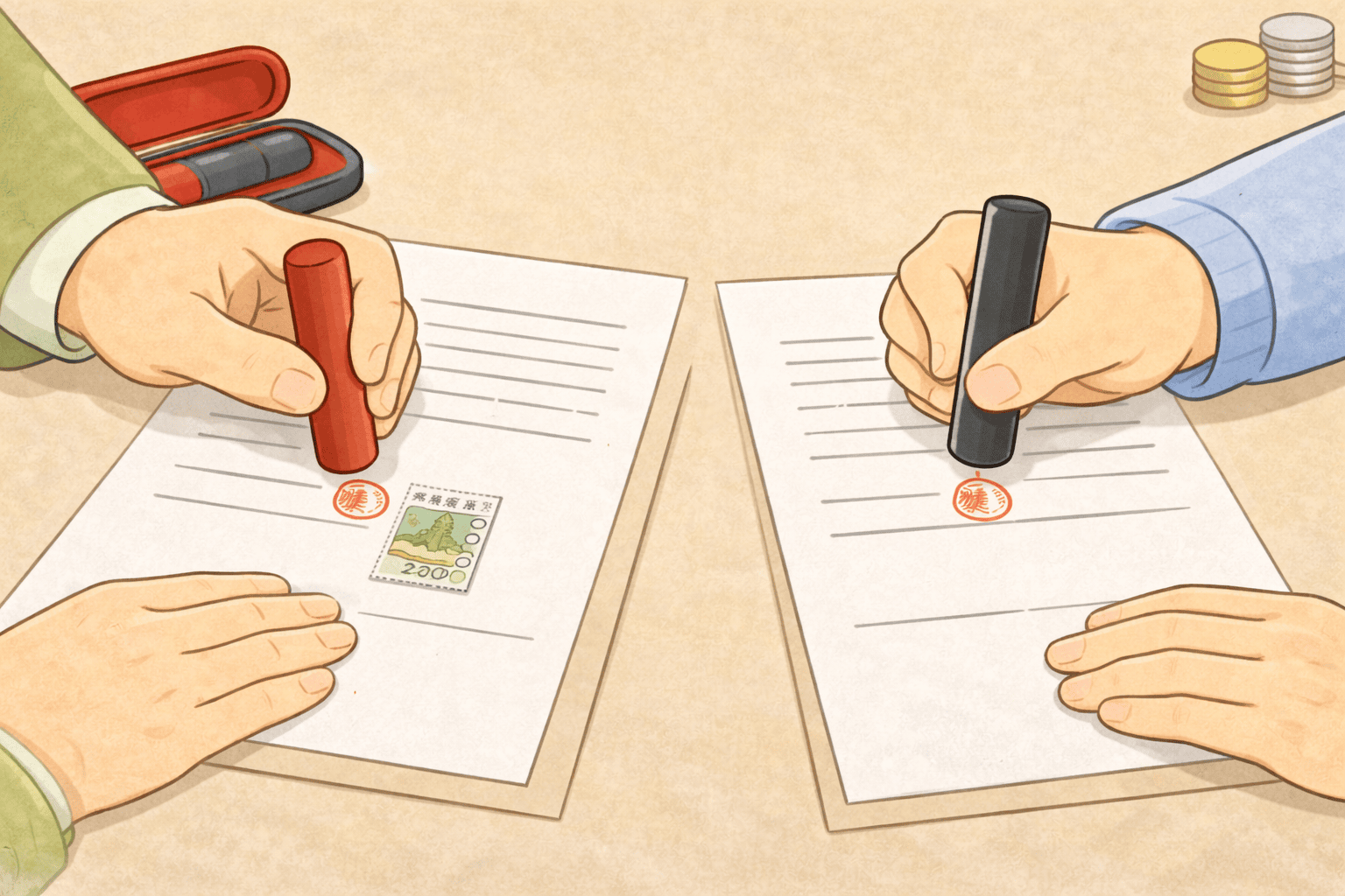重要事項の説明が終わり、双方が納得したうえで、正式に契約締結をします。必要になる全ての書類に、住所や氏名などを記載し、署名・押印を行います。このときに、収入印紙を貼ります。(電子契約の場合、収入印紙は原則不要。)