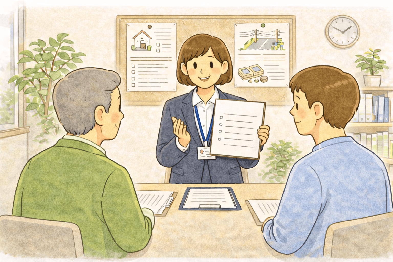 この説明の時間は、特に大切な時間です。分からない点はその場で確認し、不安を取り除いておきましょう。契約前に丁寧に確認しておくことで、引き渡し後のトラブル防止につながります。