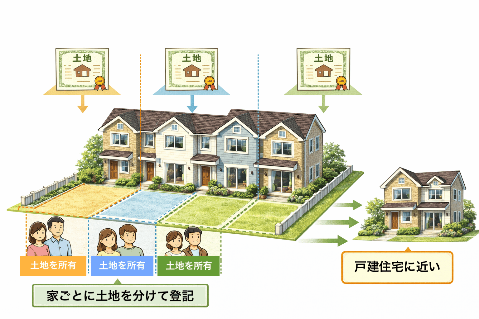 一方、テラスハウスは、土地を分けて登記し、各住戸がそれぞれ土地を所有しているケースが一般的です。建物の構造ははタウンハウスと基本同じですが、権利関係としては戸建て住宅に近い形になります。